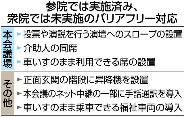 参院では、車いすを使うれいわ新選組の木村英子さん(56)、舩後靖彦さん(64)が初当選した19年夏以降、約8億円を投じてバリアフリー化が進み、本会議場に大型の車いすのまま利用できる議席を設置。投票や演説を行う演壇につながるスロープも整備した。