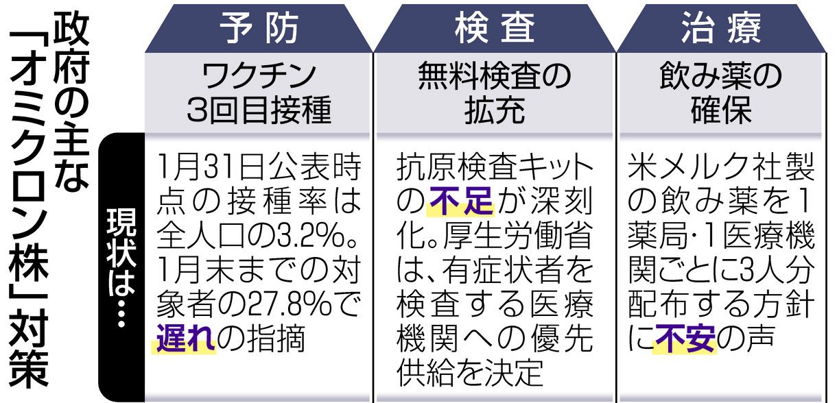 新型コロナウイルスの新変異株「オミクロン株」の流行で、政府の対応が後手に回っている。3回目のワクチン接種は計画を大きく下回り、検査キットや経口治療薬も供給が間に合わず、「最悪の事態を想定した万全の体制」(岸田文雄首相)にほころびが生じた。政府が感染拡大の見通しを見誤り、接種の前倒しの決断も遅れた影響から、予防、検査、早期治療という対策の3本柱が揺らいでいる。(柚木まり)