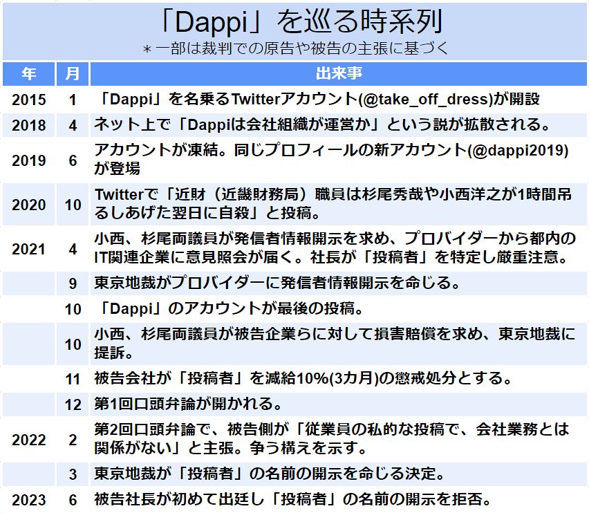 X(旧Twitter)の匿名アカウント「Dappi」。虚偽の投稿で名誉を傷つけられたとして立憲民主党の国会議員2人が、東京都内のIT関連企業に対して損害賠償などを求めた民事訴訟は、そもそもどんな裁判だったのか。どのようなアカウントだったのか。これまでの経緯をまとめた。(デジタル編集部)