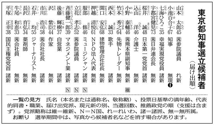午後一時現在、立候補を届け出たのは二十一人で、過去最多の前回知事選に並んだ。主な候補者は届け出順に、れいわ新選組代表の山本太郎氏(45)、自民党と公明党の実質支援を受ける現職の小池氏、立憲民主党と共産党、社民党が支援する元日本弁護士連合会会長の宇都宮健児氏(73)、日本維新の会推薦の元熊本県副知事小野泰輔氏(46)、NHKから国民を守る党推薦で諸派の同党党首立花孝志氏(52)ら。