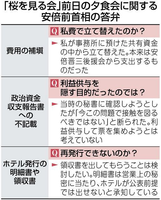野党が質問状で明細書や領収書の提示を求めたのに対しては、事務所には残っておらず、ホテルから再発行もされないとする従来の説明を繰り返した。安倍氏は補填分が夕食会参加者の飲食費には充当されず、地元有権者への利益供与を禁じる公職選挙法には抵触しないと主張しているが、裏付けとなる資料は示さなかった。